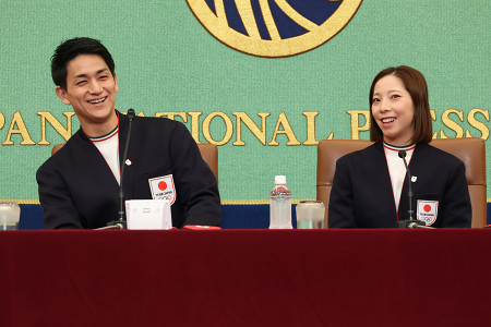 日本記者クラブで会見し、質問に答えるフィギュアスケートペアの「りくりゅう」こと三浦璃来(右)と木原龍一。今後について、木原は将来的に2人でペアのコーチに転身する意向を明かした=25日、東京都千代田区 【時事通信社】