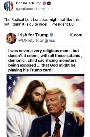 トランプ米大統領は15日、キリストが自身を抱き寄せる姿が描かれた画像をSNSに投稿。12日にも、自らをキリストに見立てた画像を投稿して批判を受けており今回も物議を醸しそうだ。(トランプ氏のSNSより) 【時事通信社】