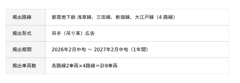 精密測定機器メーカーの新潟精機株式会社(本社:新潟県三条市、代表取締役:五十嵐利行)は、2026年2月中旬より、都営地下鉄4路線(浅草線、三田線、新宿線、大江戸線)の吊手(吊り革)広告に、自社製品「快段目盛(R)(かいだんめもり)」の掲出を開始しましたので、お知らせいたします。