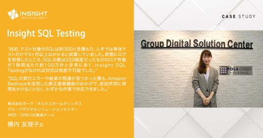 株式会社インサイトテクノロジー(本社所在地:東京都渋谷区、代表取締役社長 CEO:森田 俊哉、以下:インサイトテクノロジー)は、株式会社ポーラ・オルビスホールディングス(本社:東京都中央区、代表取締役:横手 喜一、以下:ポーラ・オルビス)の中核ブランドであるオルビスのECサイトに対し、データベース(Amazon Aurora MySQL)バージョンアップにおける網羅的なSQLテストソフトウェア「Insight SQL Testing」を提供し、短期間での確実なバージョンアップの成功を支援したことをお知らせします。