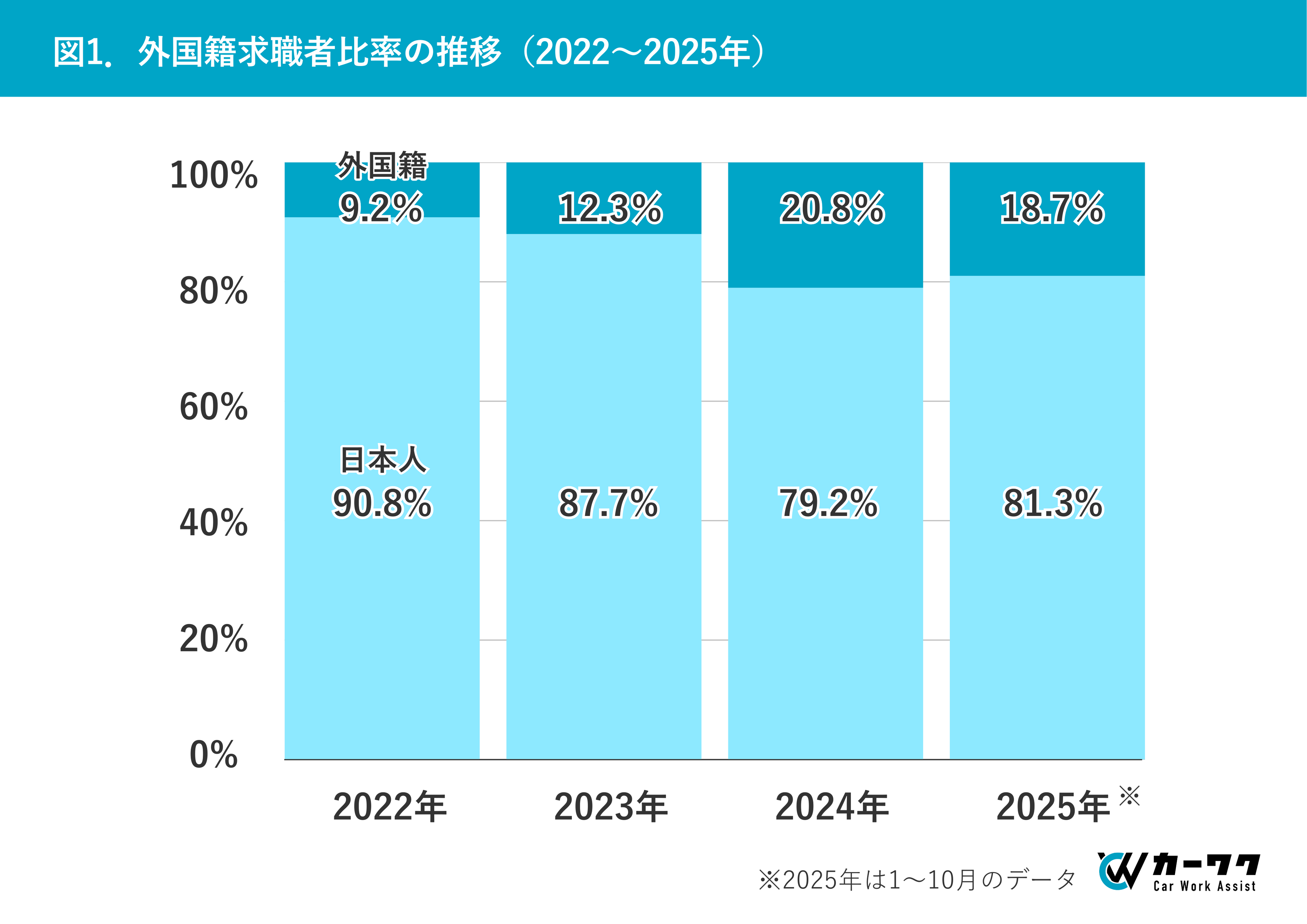 自動車業界専門の求人サイト『カーワク』( https://carworkassist.com/ )を運営する株式会社アプティ(本社:東京都渋谷区、代表取締役:井田秀明)は、2022年から2025年10月までの転職相談データ11,689件をもとに、自動車整備士における外国籍求職者の動向調査を実施しました。