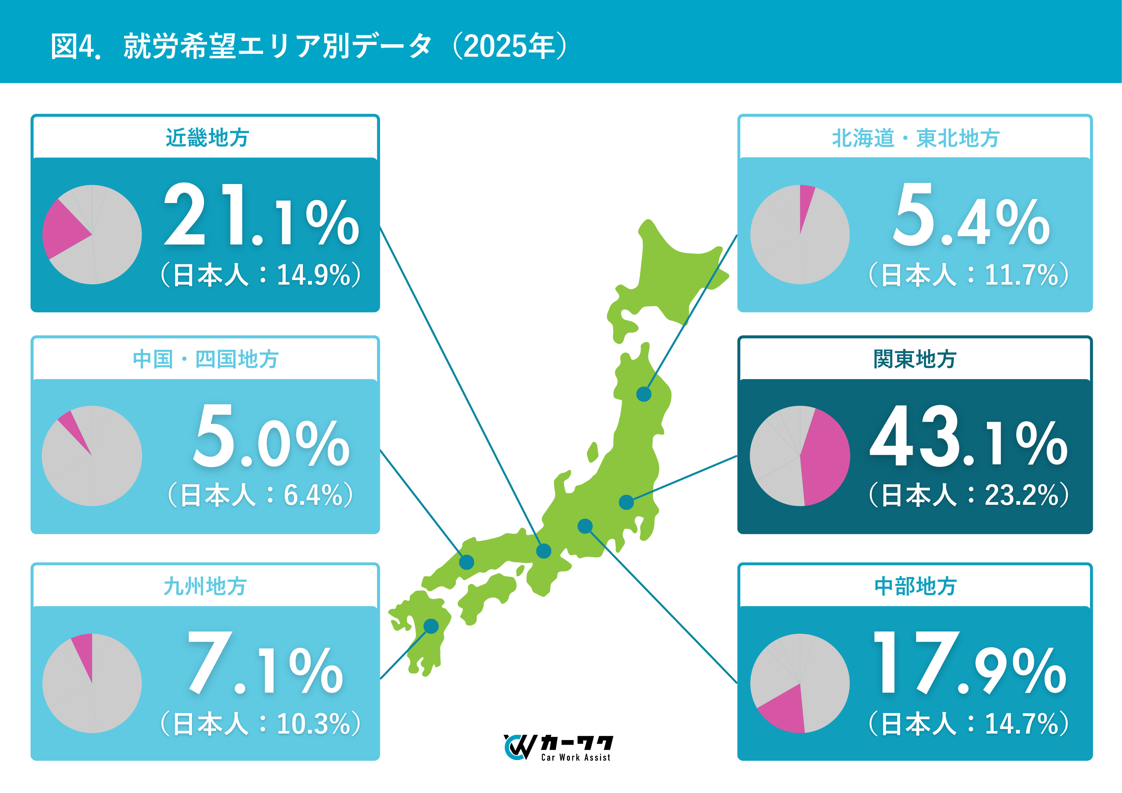 4.地域傾向…就労希望地は「関東」に集中。地方は外国人受け入れの課題も