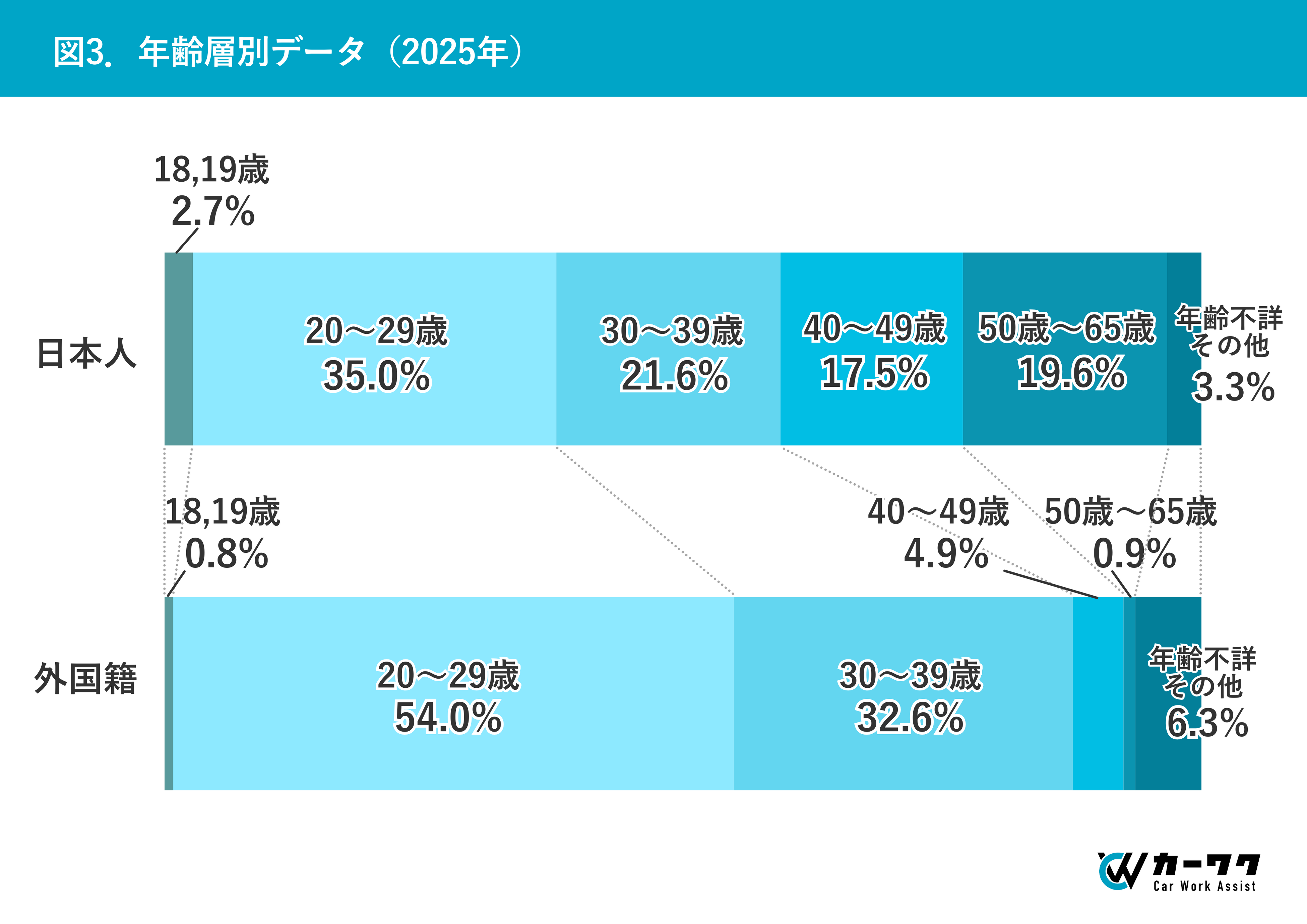 日本人の5人に1人が「50歳~65歳」であるのに対し、外国籍整備士は「29歳以下」が約55%を占め、9割近くが「39歳以下」ということがわかります。
